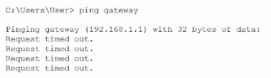 The administrator ran ping gateway and received "Request timed out" responses, indicating that the workstation cannot reach its default gateway at 192.168.1.1. The default gateway is the router that connects the local network to other networks (including the internet). Since the workstation has a valid IP address (192.168.1.27) and subnet mask (255.255.255.0), local network communication should work, but the failure to ping the gateway means the router is either down, misconfigured, or not responding. Without access to the router, users cannot reach resources outside their local subnet, including other workstations on different subnets and the internet.