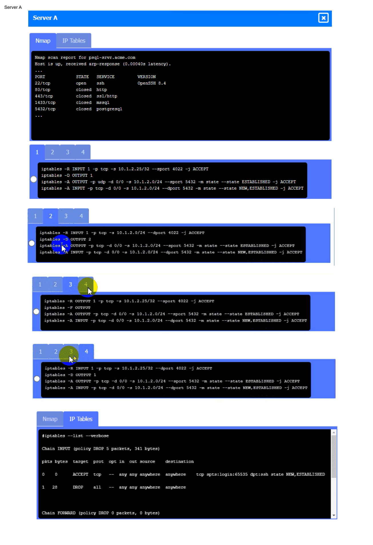 Click on Server A to review output data. Select commands in the appropriate tab to