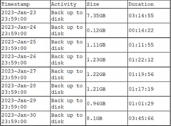A DBA is reviewing the following logs to determine the current data backup plan for a