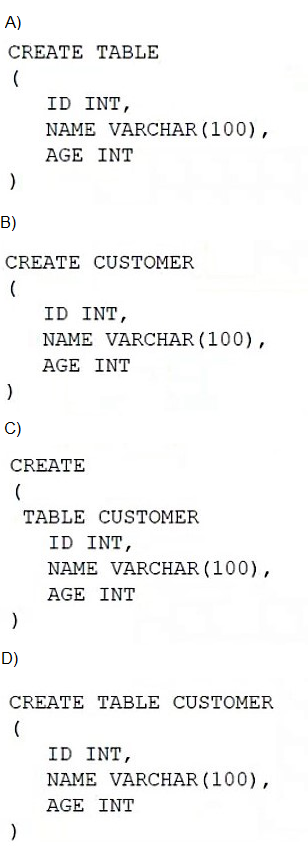 Option D follows this syntax exactly: CREATE TABLE CUSTOMER (ID INT, NAME VARCHAR(100), AGE INT)
